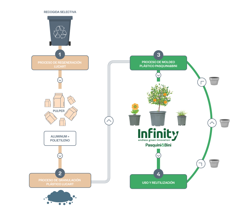 La línea Infinity es la revolución verde para tus cultivos de alto rendimiento. Esta maceta especializada une la innovación agronómica con la sostenibilidad total. Fabricada con material Grand Plast, proveniente del reciclaje de envases Tetra Pak® , la maceta Infinity está diseñada para regular la temperatura del sistema radical, optimizando el crecimiento y la absorción de nutrientes. Al elegir Infinity, inviertes en una solución infinitamente reciclable que garantiza plantas más sanas y una mayor calidad de la cosecha.